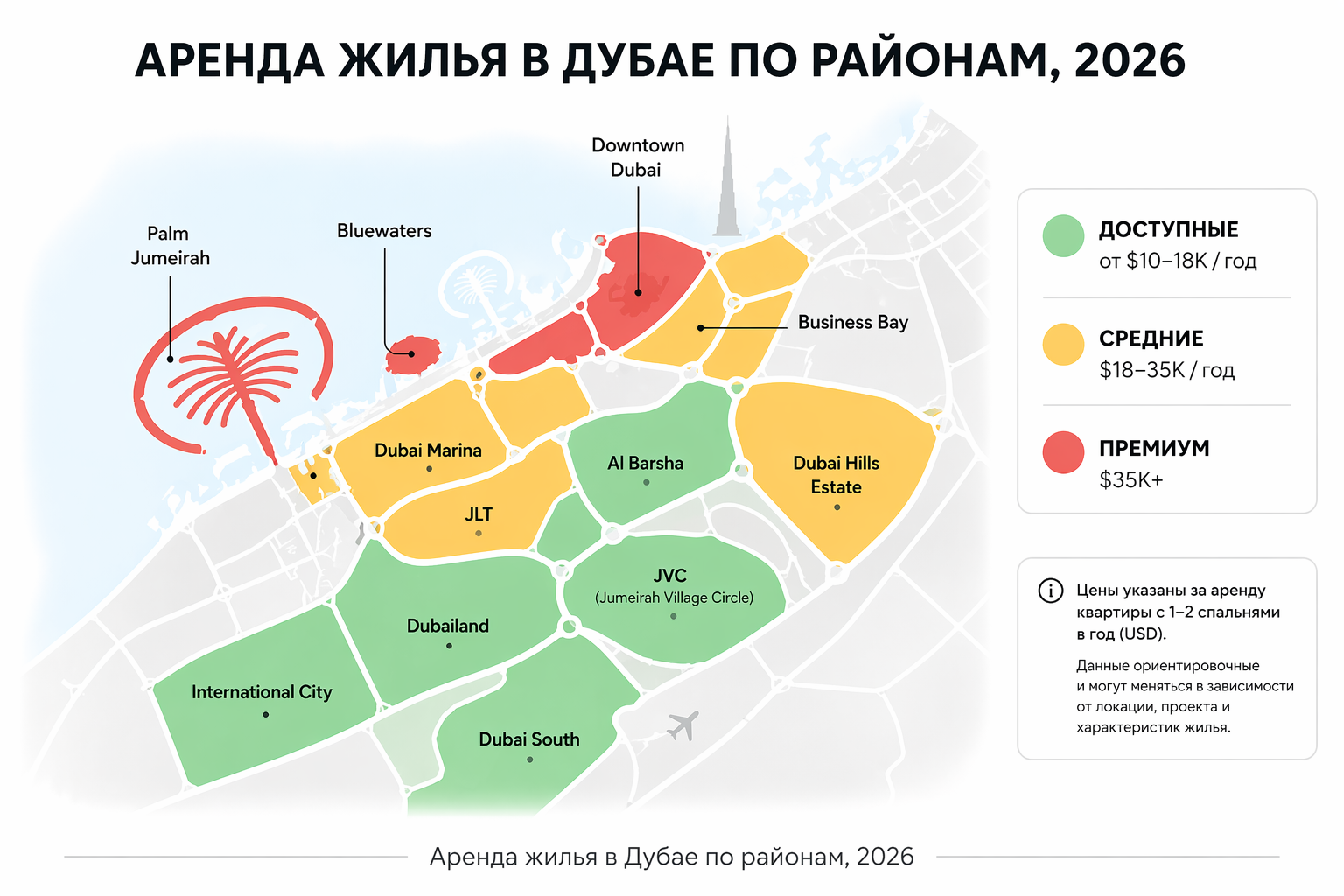 Данные основаны на рыночных наблюдениях Dallas Estate и агрегаторов Property Finder, Bayut за 2025–2026 годы. Цены указаны в AED в год — стандартный формат для Дубая. Для перевода в месяц делите на 12.