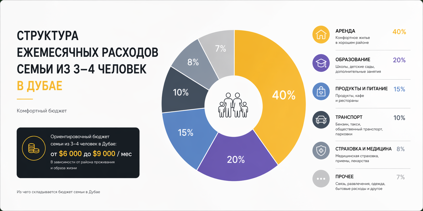 - Семья с детьми в школе: от 30 000–40 000 AED (~8 200–10 900 USD)