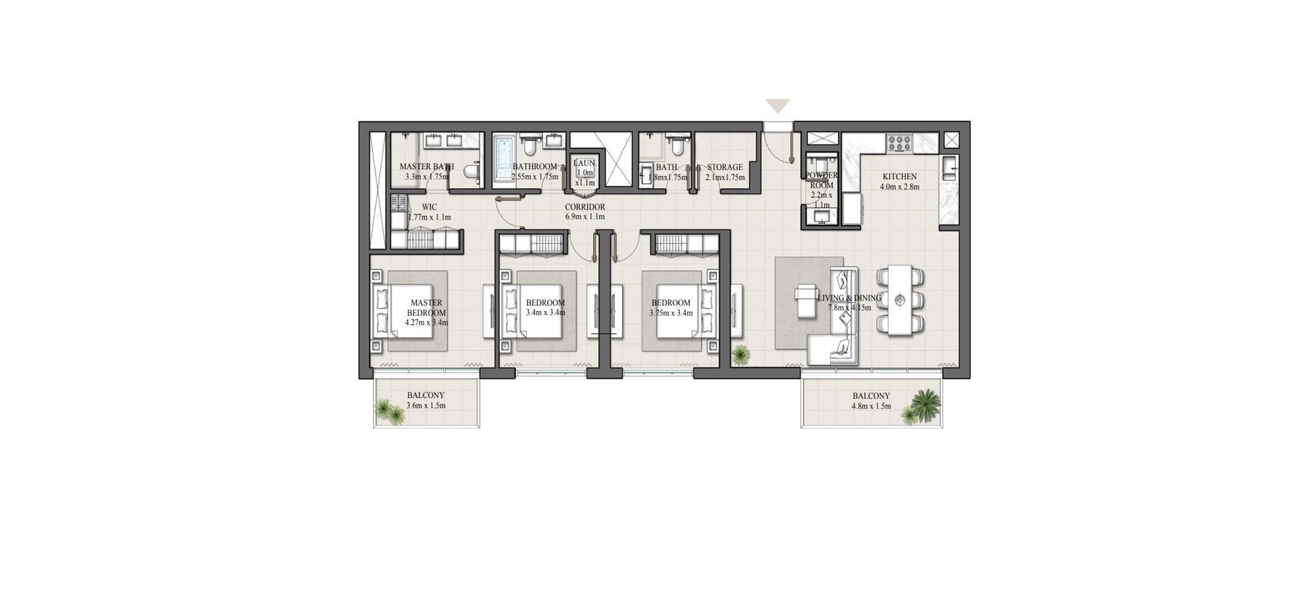 - в апартаментах с 3 спальнями предусмотрено 2 балкона и кладовая комната.