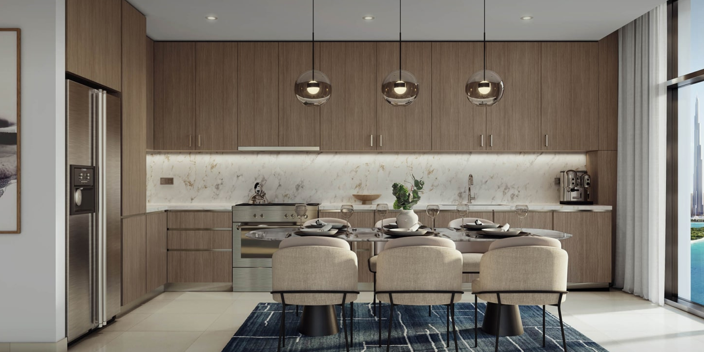 - уникальный дизайн с использованием материалов премиум-класса — дерева светлых оттенков и натурального камня (в том числе мрамора);