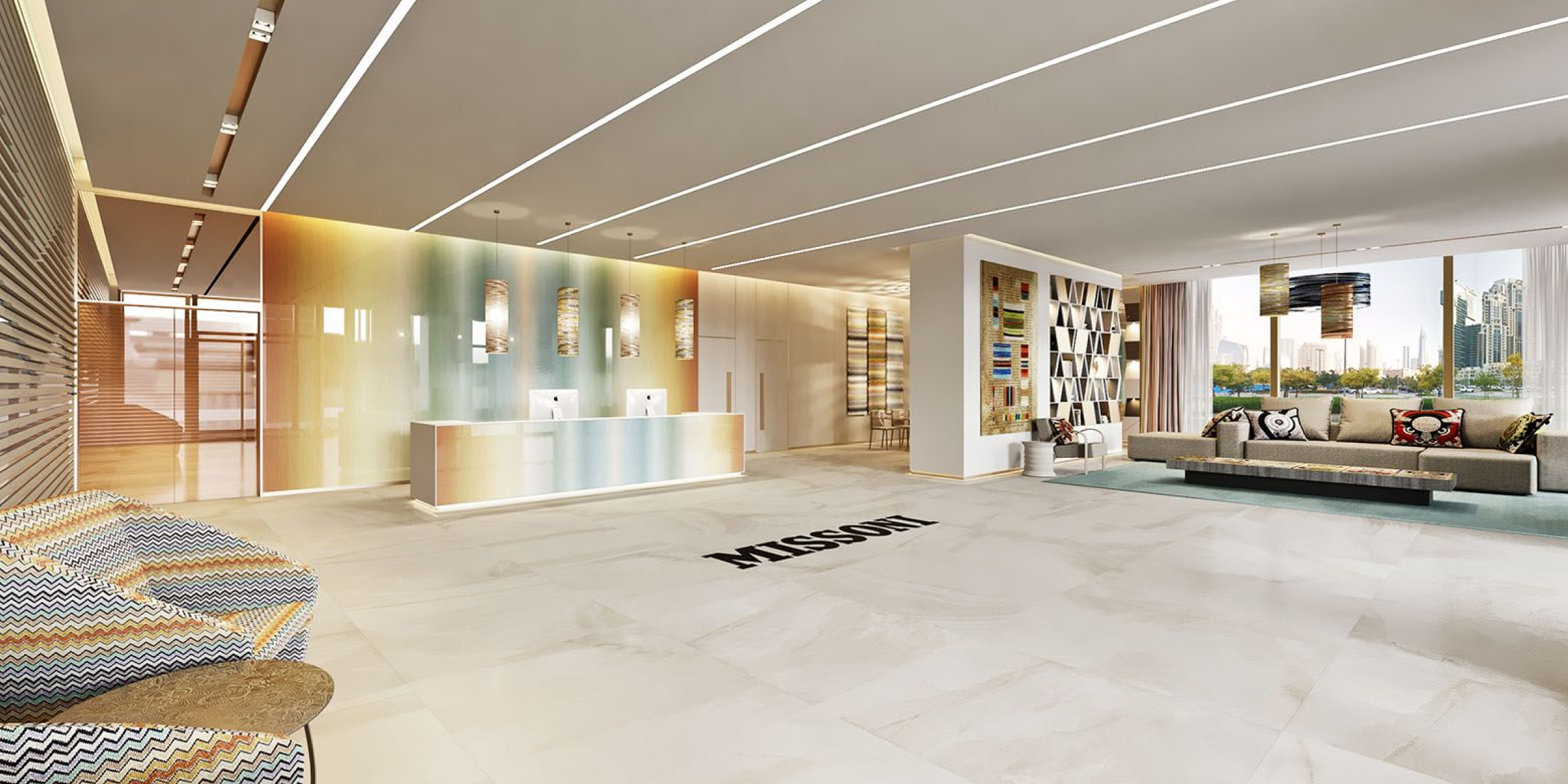 - просторный вестибюль жилого комплекса будет произведением искусства с фирменными зигзагообразными узорами, лоскутными рисунками и геометрическими формами итальянского бренда.