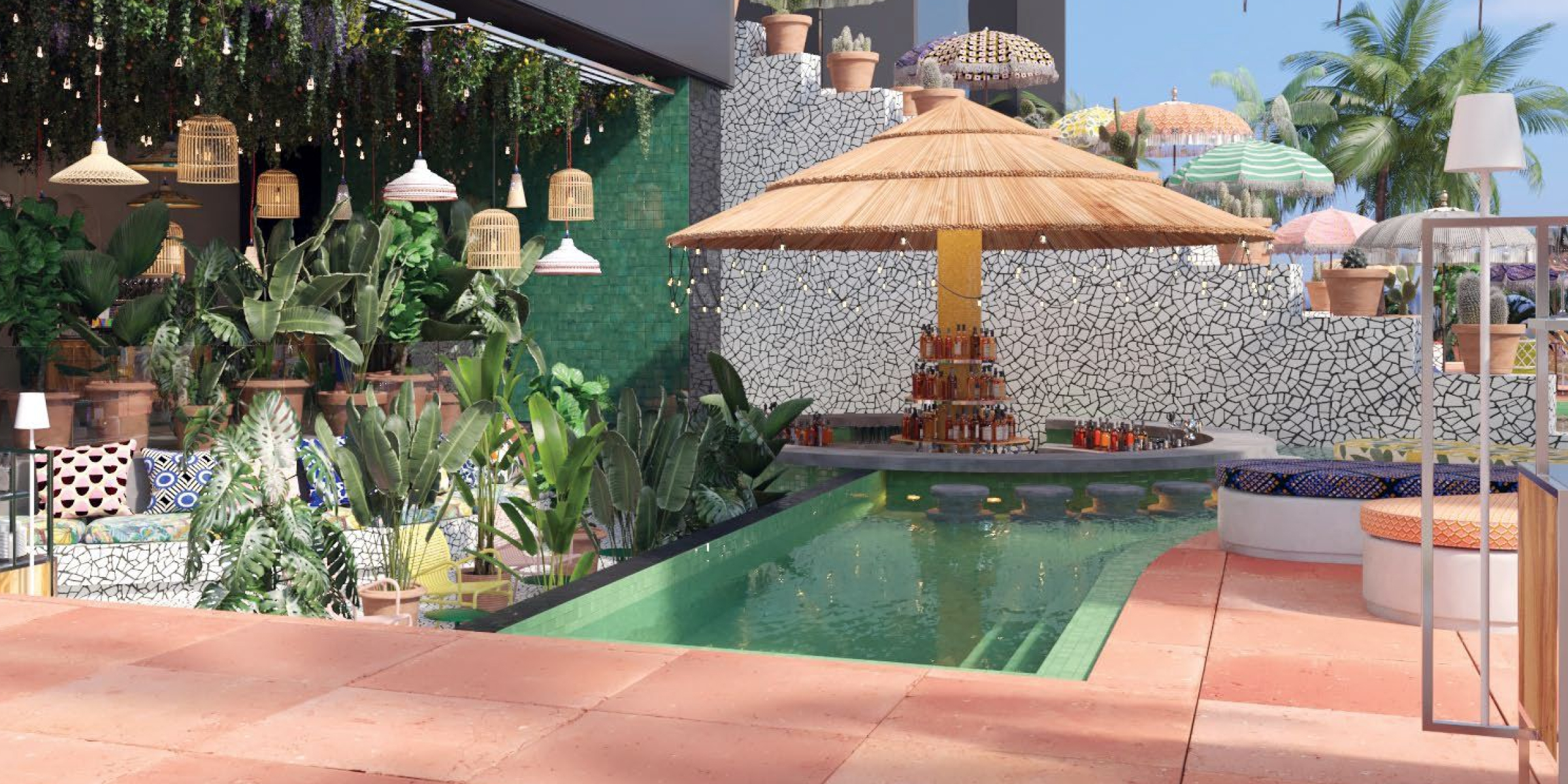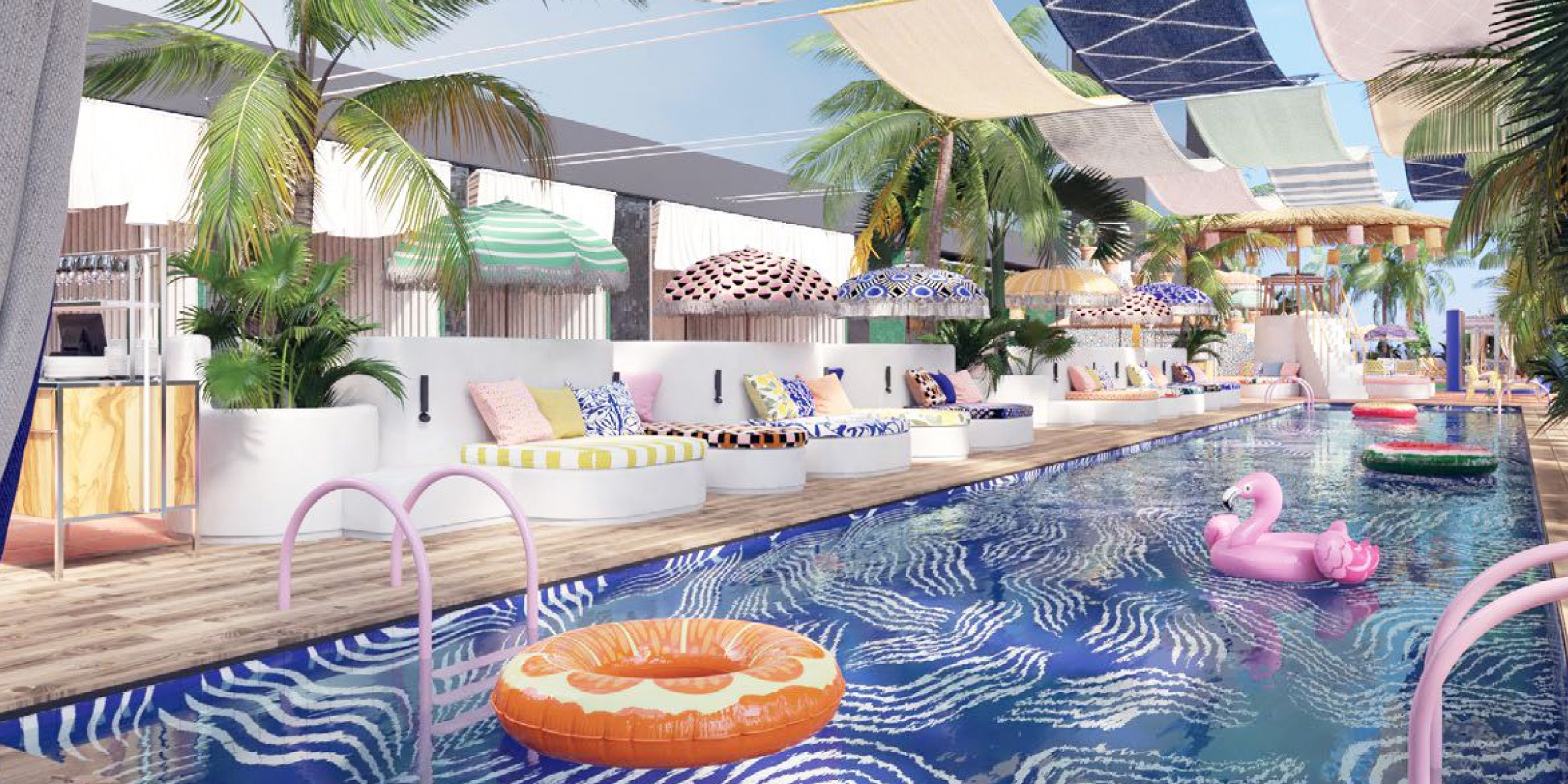 - терраса бассейна с несколькими барами, стойкой для ди-джея, шезлонгами, беседками и игровыми зонами;