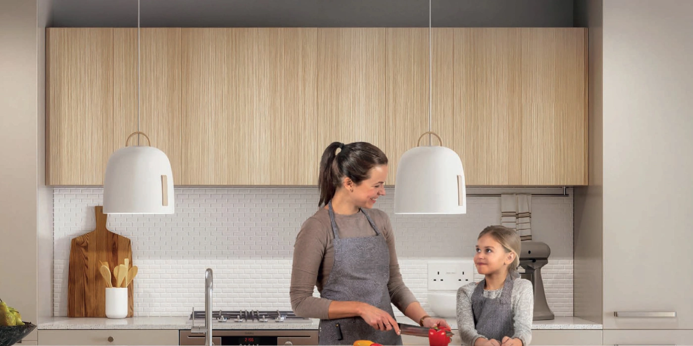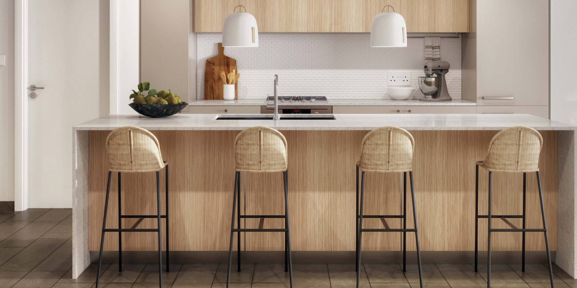 - кухни со встроенной техникой и стойкой для завтрака, которую также будет комфортно использовать в качестве рабочей зоны;