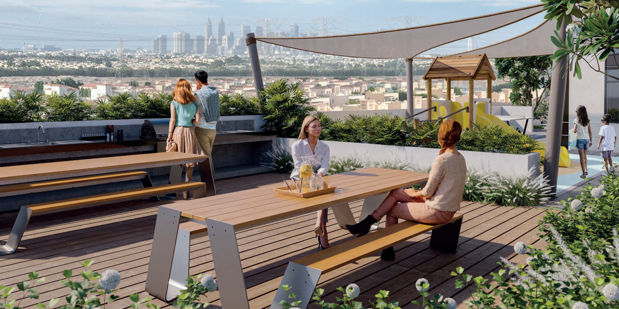 - отдельная зона для активного отдыха с затенённой кухней, гостиной, обеденными столами, местами для релаксации и открытой детской игровой площадкой.