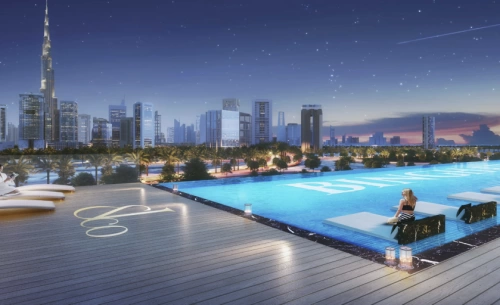 - бассейн с панорамным видом на горизонт современного Дубая;