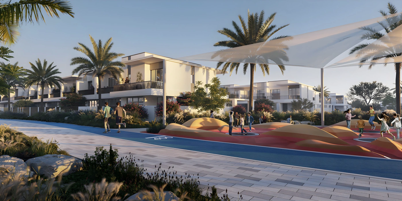 Элитный таунхаус площадью 202 кв.м в ЖК The Valley Elora с премиум удобствами, включая кафе, бассейны, парки и спортивные площадки.