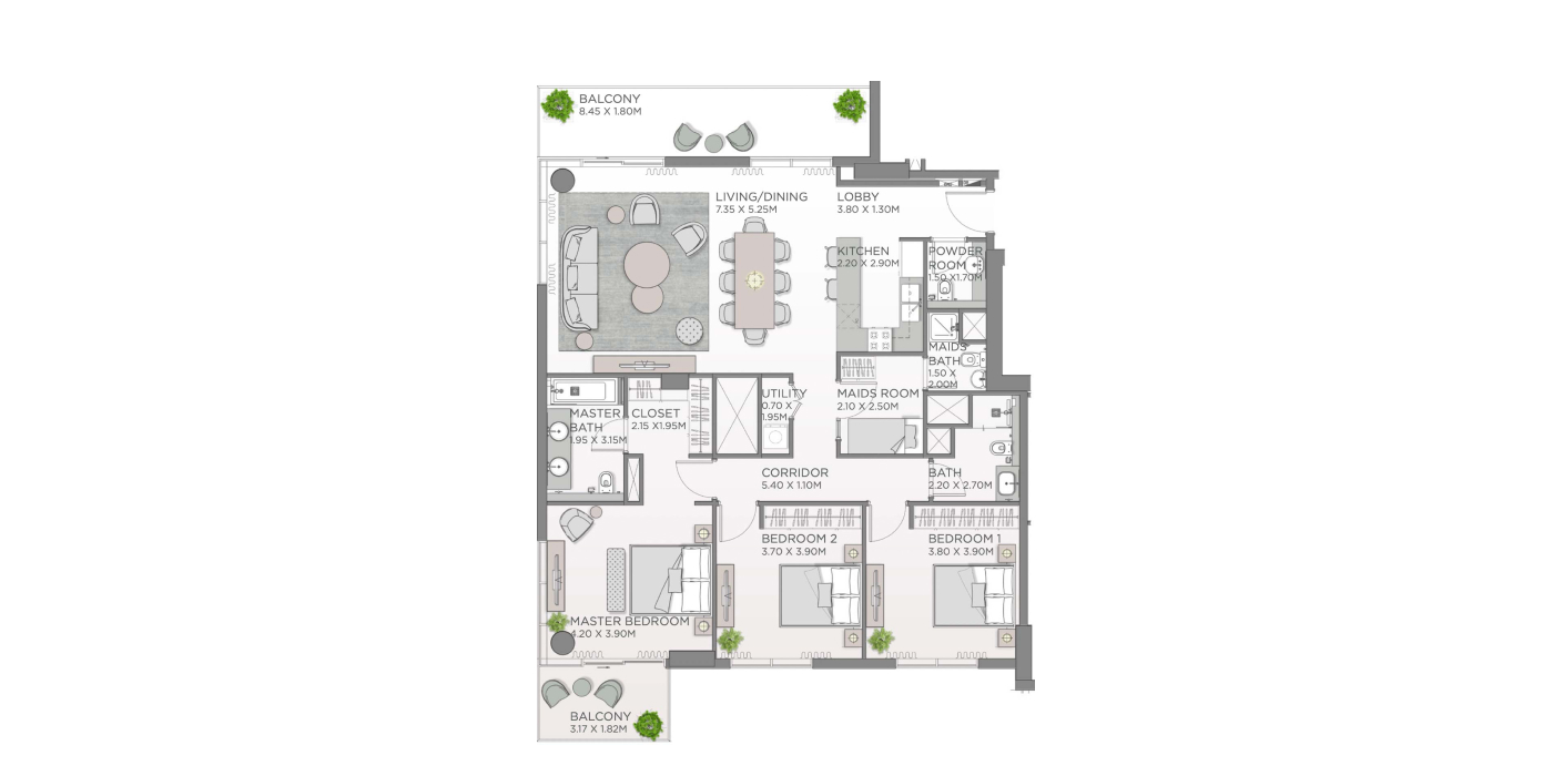 3-спальные апартаменты с частной террасой и видом на ландшафтные сады в ЖК Central Park Erin, в центральном районе City Walk.
