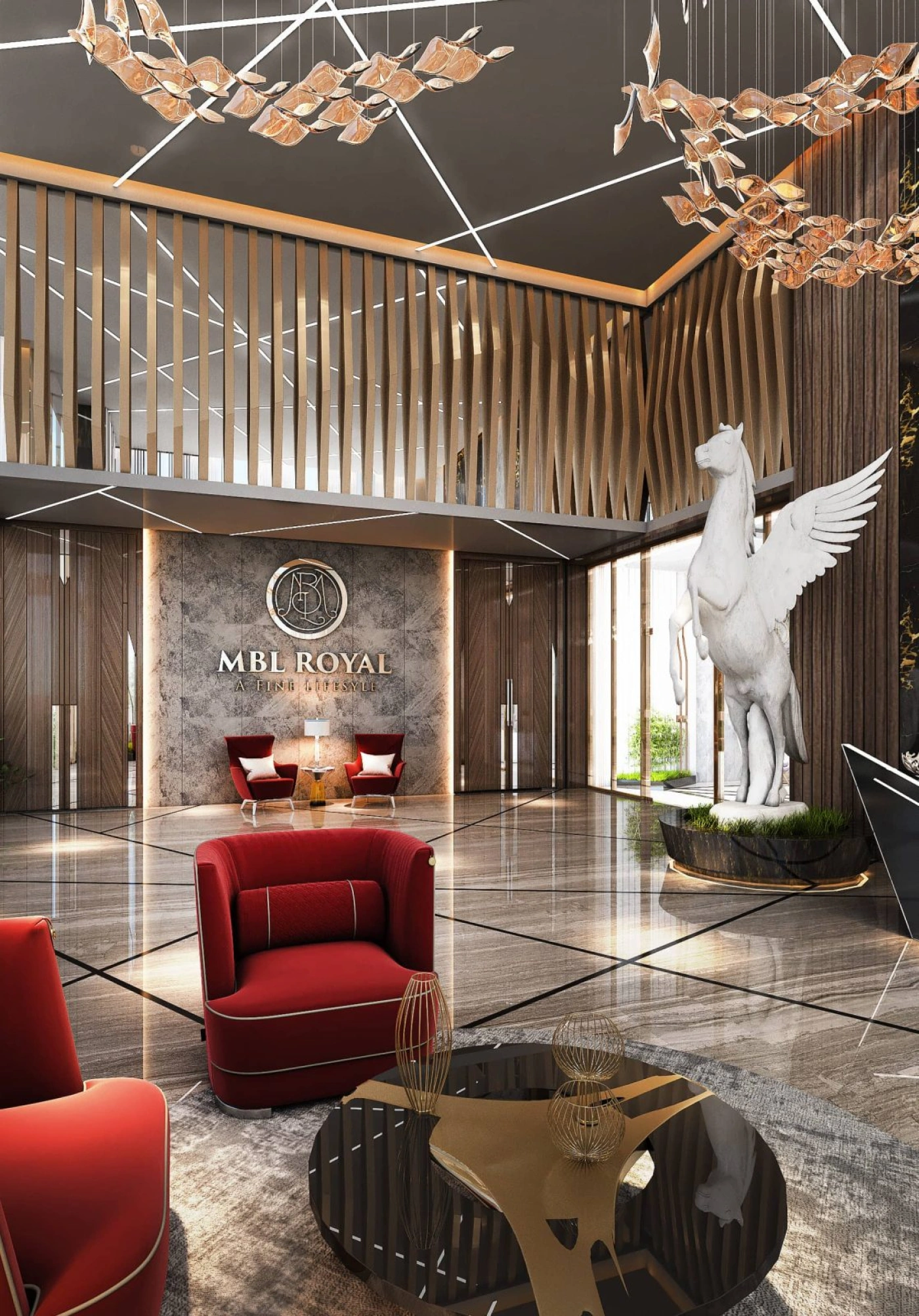 Уникальностью MBL Royal является его дизайн и отделка здания и апартаментов, определяющей характеристикой которых стала роскошь. Главной особенностью этого проекта станет стильная лаундж-зона в вестибюле. Его пространство будет оформлено с применением деревянных панелей, элементов черного мрамора, замысловатых люстр и стальных аксессуаров. Для максимального удобства и комфорта гостей и жителей предусмотрены изысканные кресла и мягкие диваны.