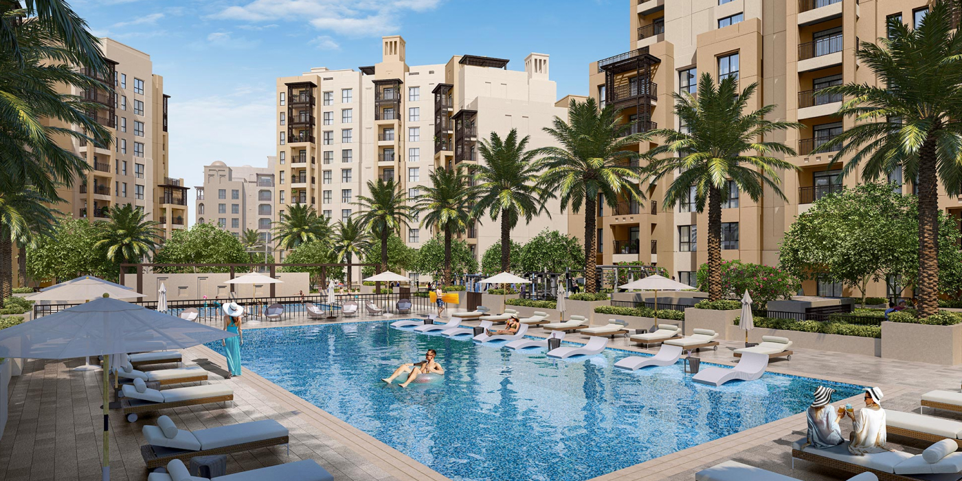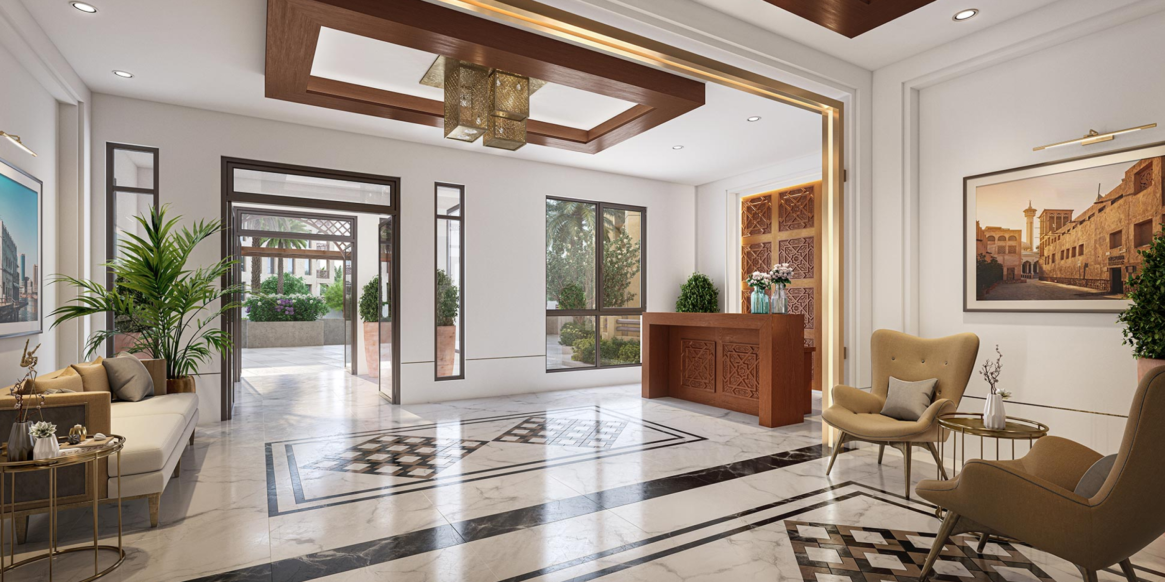 - экстерьер всех зданий выполнен в традиционном арабском стиле, а интерьер апартаментов выдержан в стиле минимализма с использованием светлой цветовой палитры;